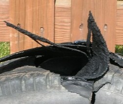 Further the top belt has that "hairy" appearance you get from a series of tears. If the failure weren't so localized I would say it was a belt-leaving-belt separation - the most common kind of failure for a steel belted radial tire. But |