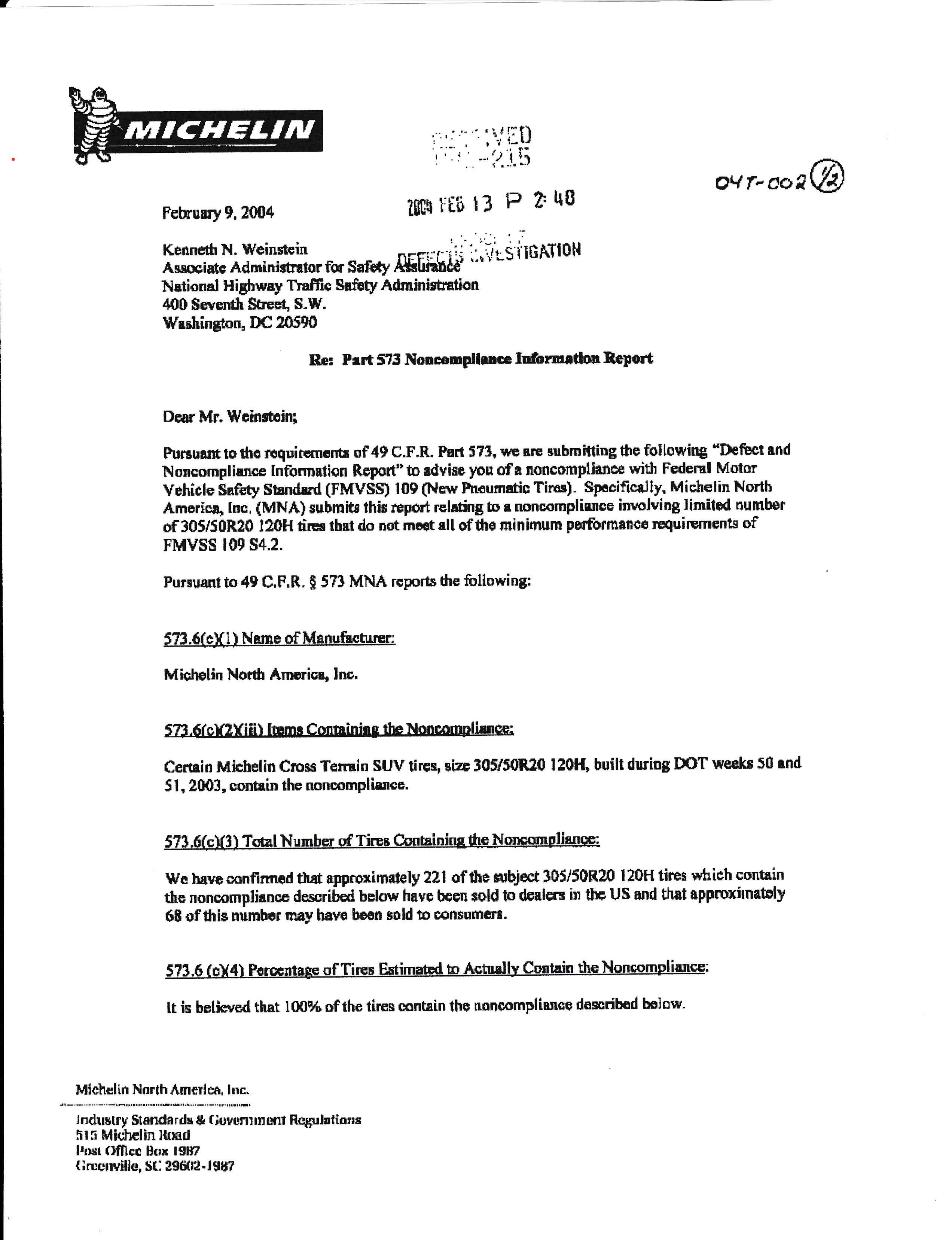 In a Voluntary Recall, the tire manufacturer (or tire distributor) decides. I think it is obvious why a manufacturer would be on the list, but a distributor? If the distributor is the importer of record - OR - he is the sole distributor! That distributor, not the manufacturer, would incur all the responsibilities and expenses involved. I am not going to go into how these decisions are made as there are many ways a tire manufacturer (or tire distributor) can decide that a recall is needed. I am going to talk about what happens after that. Once the decision is made, the manufacturer will write a letter to NHTSA, informing them of the recall. The letter will include the following: |