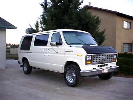 I am going to do these measurements using the rear axle of a 1987 Ford E-150, much like the one pictured to the right. The rear axle is solid (not independent) and that means I can use the center of the axle (where the differential is housed) to lift and lower the vehicle without inducing a tilt. The van is also pretty heavy and lowering the inflation pressure is going to have more of an effect. At the time I am writing this, the weather outside not suited for this activity, so I'll outline what I expect to happen, then document the actual results. I'll take photos so you can see how I did it. |