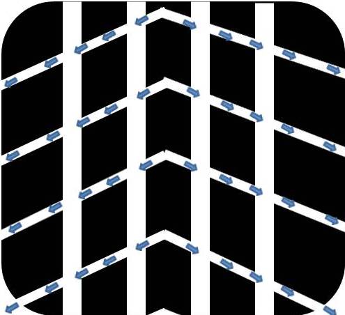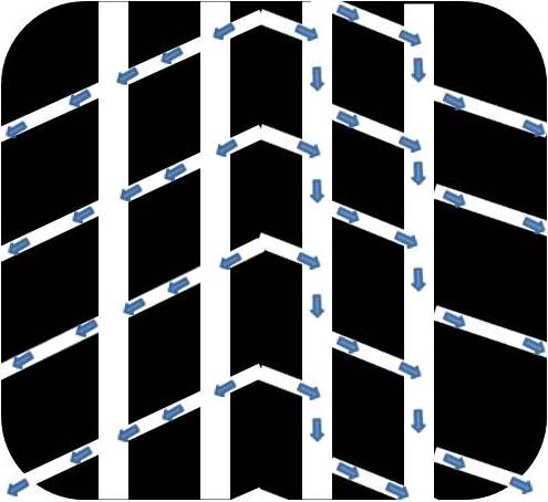 The drawing to the right is exactly the same image as the one above - it has the same width, the same width grooves, the same angles to the cross grooves, the same width of the ribs - everything except I reoriented the cross grooves in the form of a "V" - and that makes it directional. |