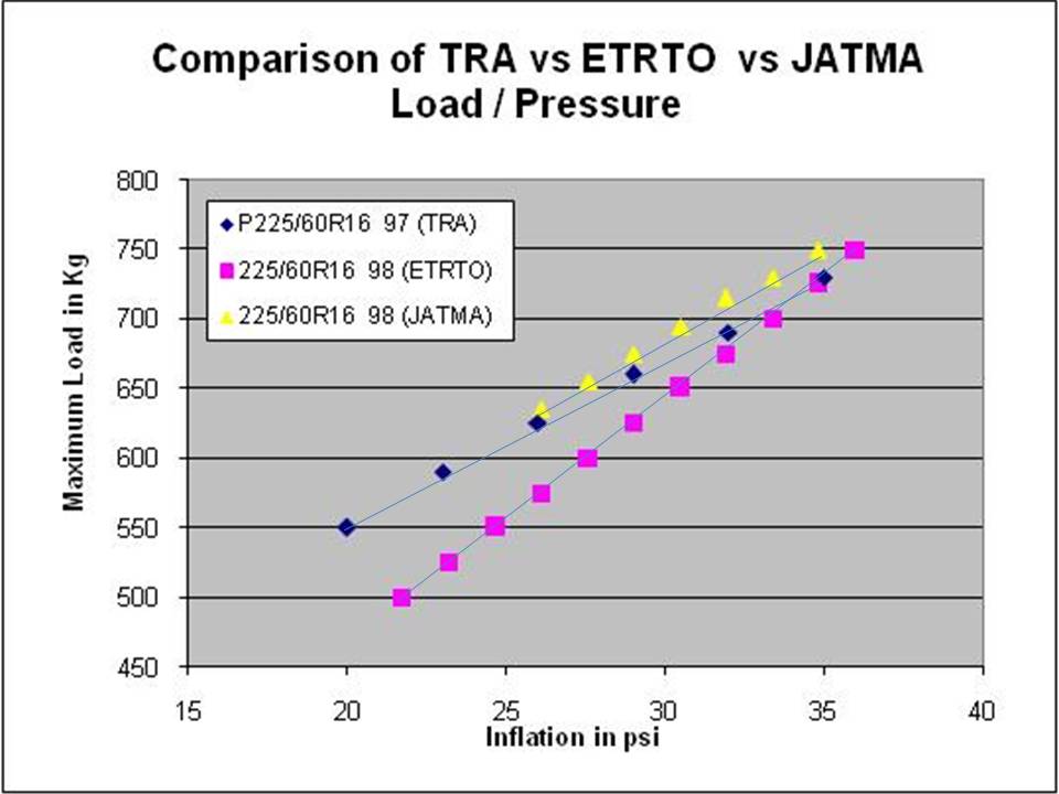 From a tire's perspective it doesn't matter which organization's curve is used, the tire construction is going to be the same. Please note I am not saying that different manufacturers will have EXACTLY the same construction, but they are surprisingly close. What the average person should take from this is that while there are slight differences, for practical purposes it doesn't matter who manufactures the tire, if the size is the same, then from a load carrying capacity point of view, it can be used interchangeably. I should point out that a tire manufacturer is under no obligation to exactly follow any particular tire load standard, but it would be kind of foolish NOT to do so since the vehicle manufacturers use these load standards when selecting tire sizes and inflation pressures. |
