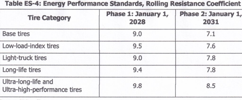 - All applicable passenger car and light truck tires would be required to have rolling resistance values below a certain level in 2 phases: