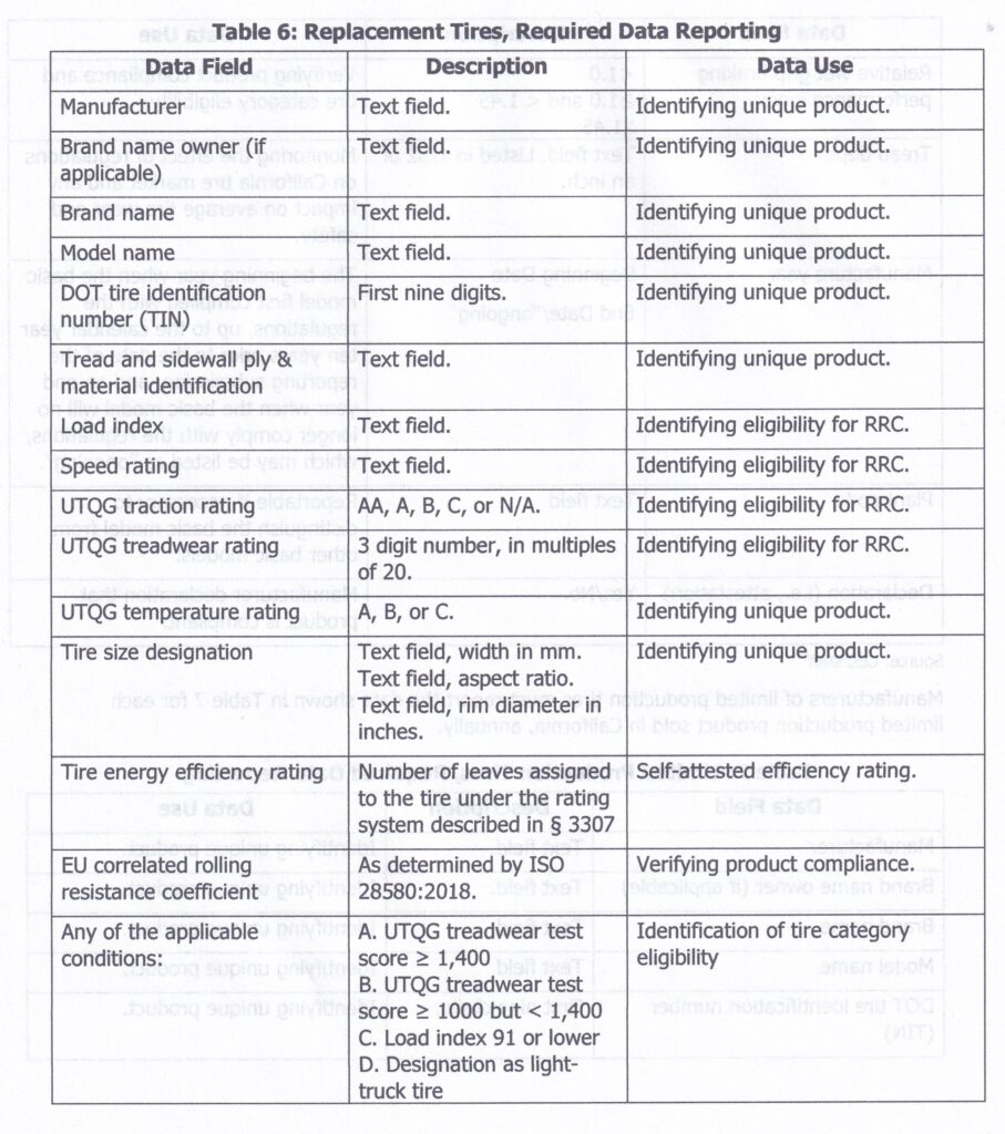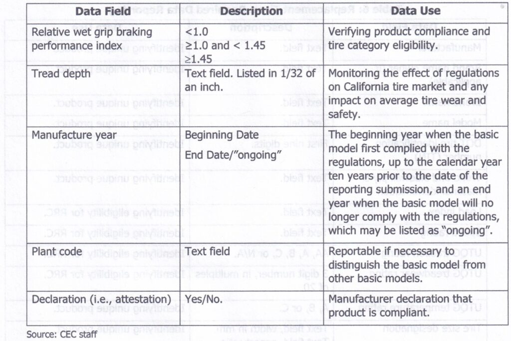 - Tire manufacturers (or brand owners) would be required to supply data to the CEC broken down by make/model/size in Phase 1. Some of the data includes: