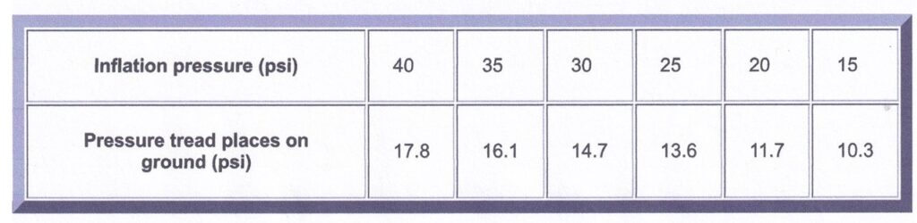 While the radial tire is 100 psi contact pressure at 100 psi inflation pressure, the contact pressure is 88 psi at 80 psi inflation pressure.