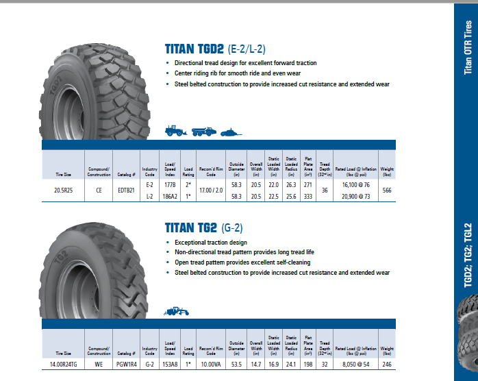 | Revised July, 2 023: And yet another one: This time it’s a bit unusual. Titan OTR Databook Titan International is a maker of specialty tires and wheels for such industries as mining, construction, agriculture, etc. Because of the nature of how these tires are used, it is common for tire makers of such tires to provide more data than you get with a passenger car tire. (Please note that the book changes from time to time, so you may find the link doesn’t work. Google “Titan OTR Databook” and you should find it.) In this case the important tidbit is “Flat Plate Area”. This is the size of the footprint at the rated load and rated inflation pressure on a flat plate – hence the name. Normally, these types of tires are used on unimproved surfaces, which is why they call out a flat plate so it is clear what the entry is. I hope it is obvious that not only would this be unnecessary if the theory was true, but given this information, we can calculate what the actual footprint pressure is and compare to the inflation pressure. Let’s do the first 2 just for kicks: Page 27: |