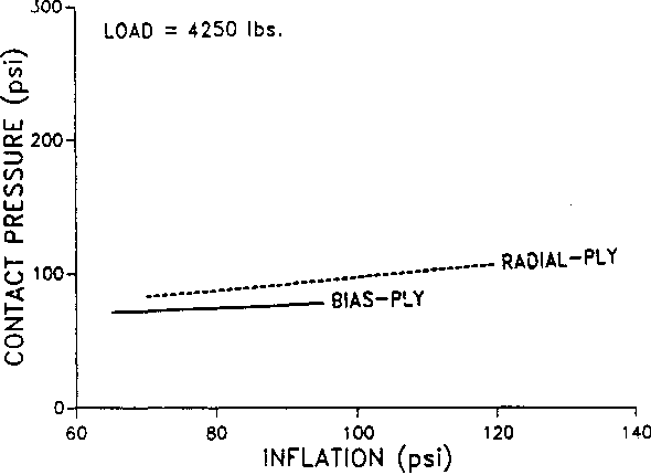 And notice that the bias ply tire contact pressure is 75 psi at 80 psi inflation pressure, and if the line were extended to 100 psi inflation pressure, the contact pressure would be 88 psi.