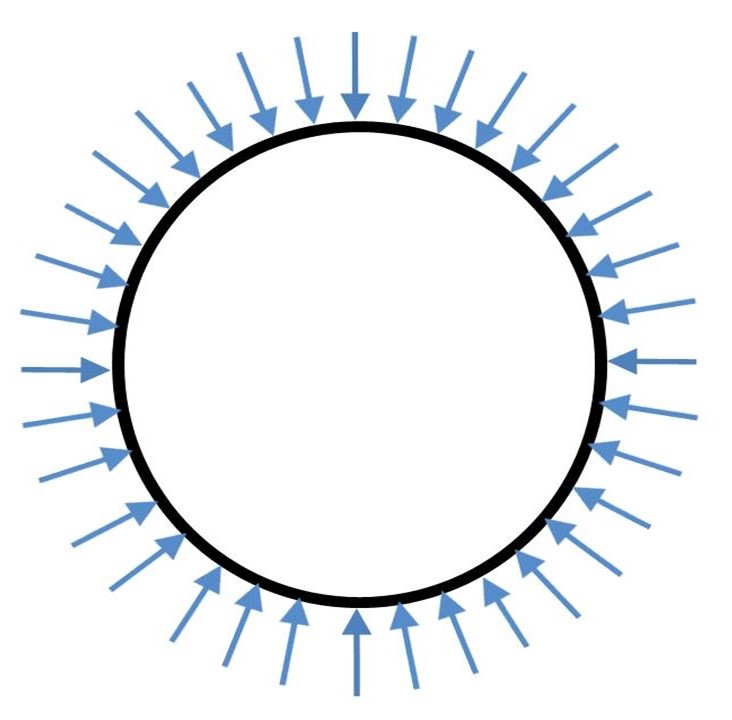 The pressure that is being exerted on the rim is the same completely around the rim. There is no pressure differential from left to right or from top to bottom. In other words, there is no sideways force being generated on the rim and there is no vertical force being generated on the rim (up and down). No net force at all – just a pressure towards the center.