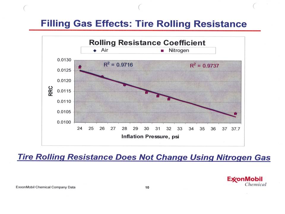 | Notice that the points lie practically on top of another – and when a best fit straight line is calculated, not only do those lines lie on top of one another, but the r2 values (a measure of how close a line fits the data points) is over 97% – an excellent fit! To add more depth to this, Dr Waddell also presented a graph showing the rolling resistance of a tire at various inflation pressures for both nitrogen and air. |
