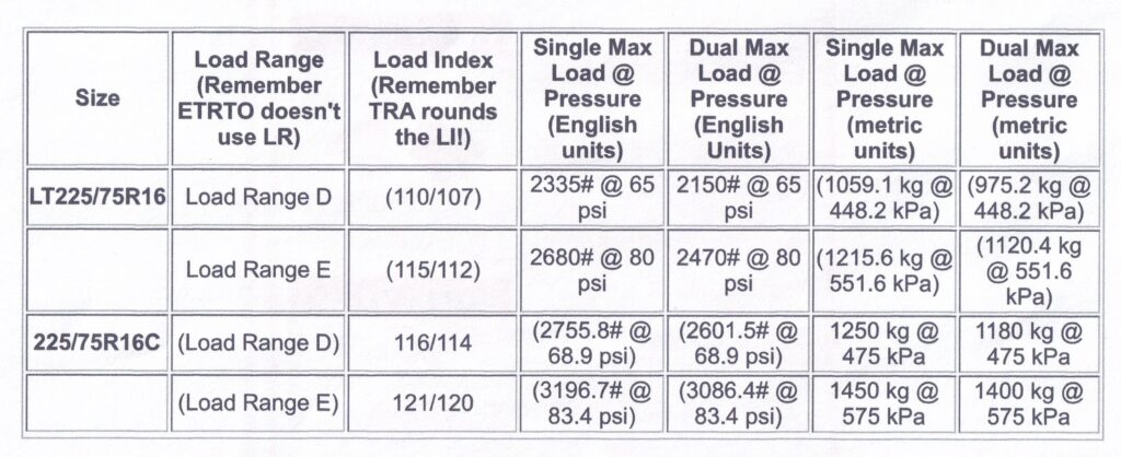 In this case, it’s the difference between The Tire and Rim Association (TRA-US) and ETRTO (European Tyre and Rim Technical Organization).TRA uses the letters “LT” in front of the “size” to designate Light Truck tires – tires designed for medium duty pickups, vans, and trailers. They come in Load Ranges and the load/inflation information is EXACTLY English units.