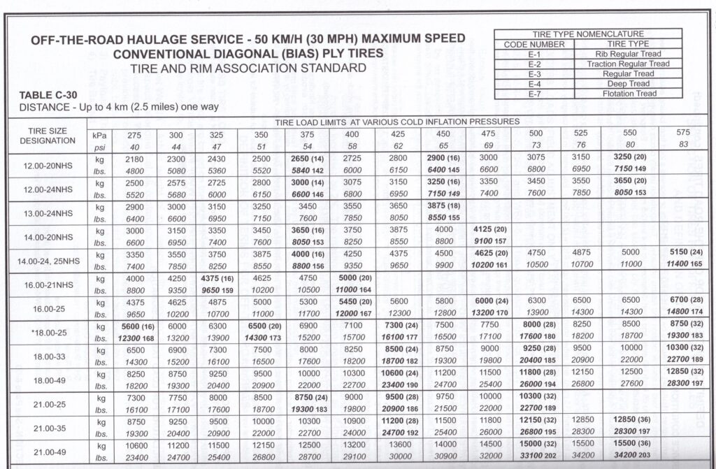 Also notice that a few lines lower, a 14.00-20HNS 16 PR has a load carrying capacity of 3650 kg (8050#) at 375 kPa (54 psi). Those pressures are quite different!.