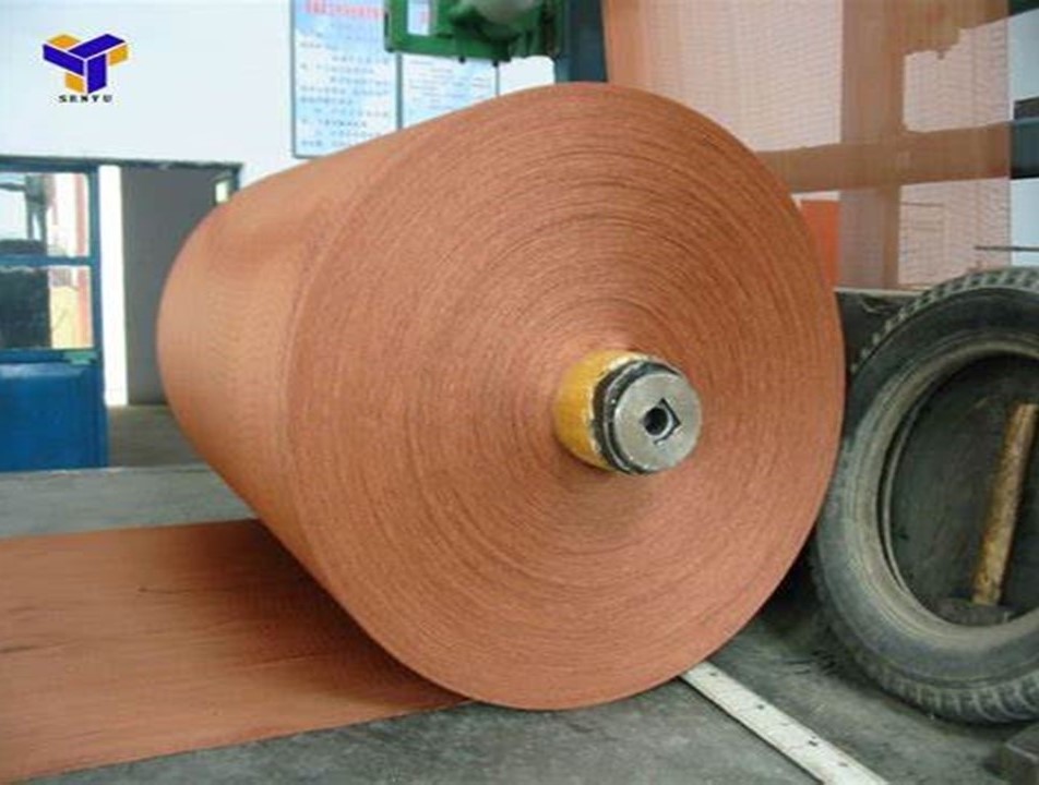 This greige roll is calendared with thin layers of rubber on both sides in preparation for use in a tire. The specifications for the tire will include the end count of the fabric being used.