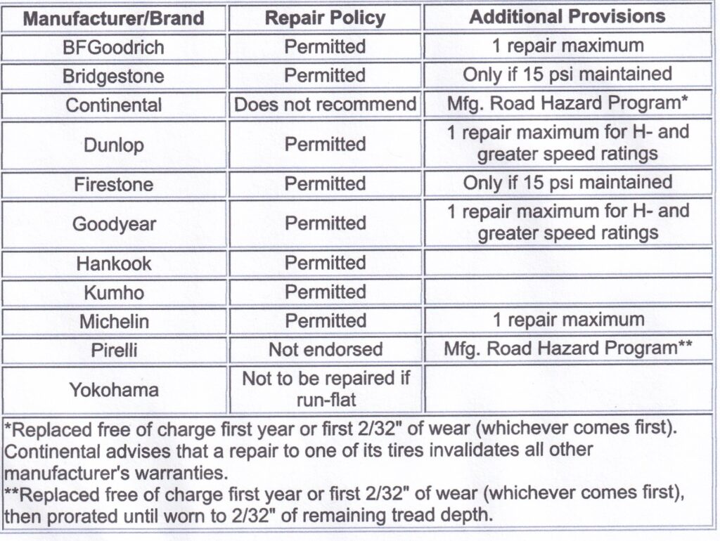 | For this reason, some tire manufacturers do not authorize repairs on their RunFlat tires. They want you to replace the tire, fearing the RunFlat tire may have failed. Please note: tire manufacturers that DO authorize such repairs are merely accepting the risk – not that they are building a better tire. Below is a list from Tire Rack. Source: Tire Rack: Can RunFlat Tires be Repaired? |