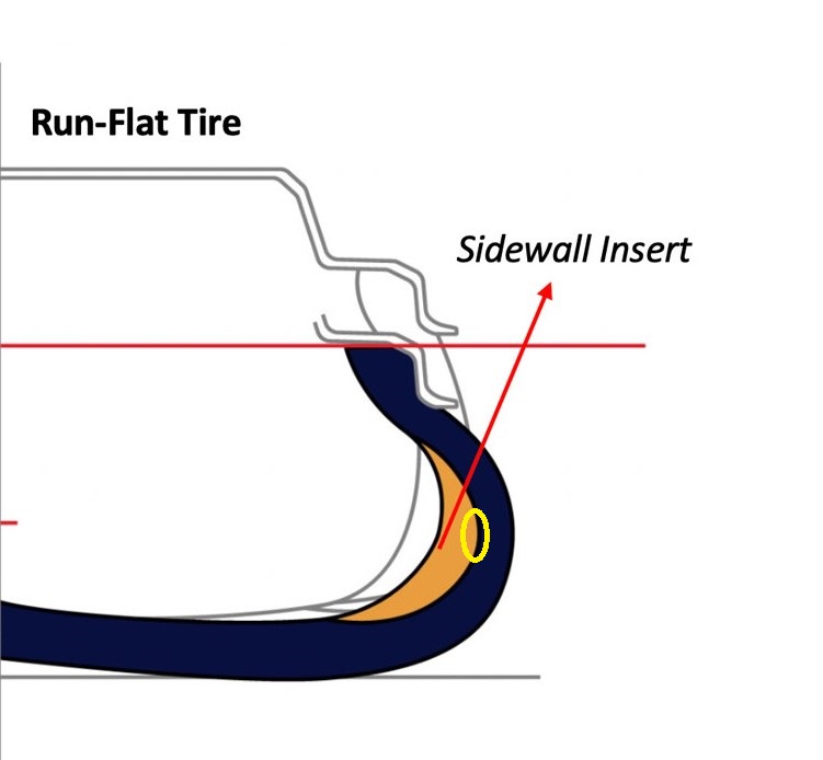 The problem with this configuration is that there is a lot of stress applied to the plies in the middle of the sidewall when the tire is flat. (Area circled in yellow). So this area sometimes fails after a RunFlat tire has been run flat. In a regular tire, you can see such a failure, but because of the thickness of the insert, you can not see this damage in a RunFlat tire.