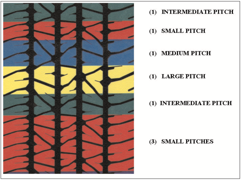 Look at the image to the left and you can see that principle in action. A tread can be designed with different “pitches” – That is, different repeatable elements of different size – and the net effect is that not only is the noise perceived to be lower, and if done correctly, the tread pattern doesn’t reinforce a given vibrational frequency.