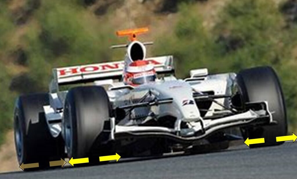 Look at the image to the left and observe that the air (yellow arrows) has to move out of the way of the rolling tires – and what I didn’t show you is that the air has to return back behind the rolling tires.