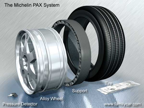 The PAX system featured a special wheel with an inner support ring, slightly smaller than the inflated tire’s diameter, to allow driving on a flat tire. This required a unique wheel design and tire mounting process.