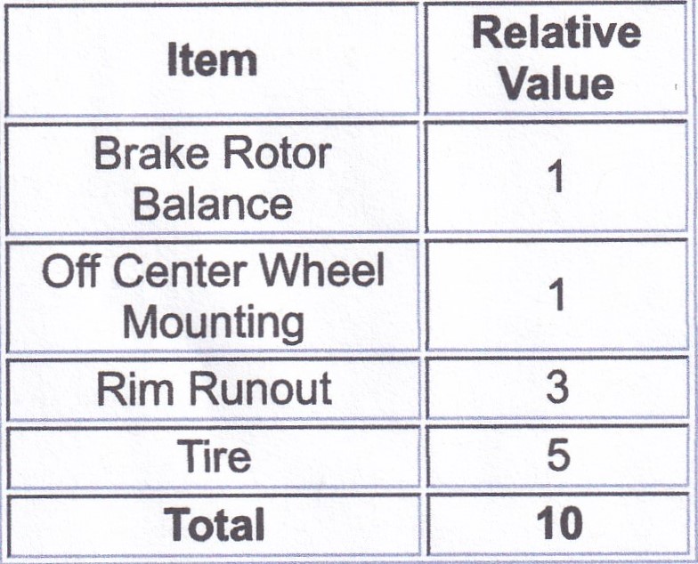 To the right is my take on the relative importance for various components that can contribute to wheel end vibration. Please note the values are unimportant, except for their relative value to each other.