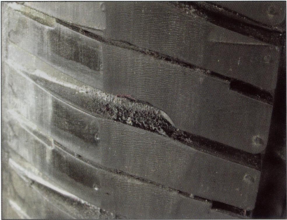 Grinding is usually used to reduce the R1H value of the tire. although it can be used to change quite a few different uniformity properties, including conicity. When done correctly, the grind should be barely visible. In other words, the grind should not be deep (we are talking thousandths of an inch, here!), there should be very little dust and there should be an ever so slightly visible texture, with, perhaps, a little bit of “heel and toe”. Sometimes a bit of the stripes or the letters would be removed.