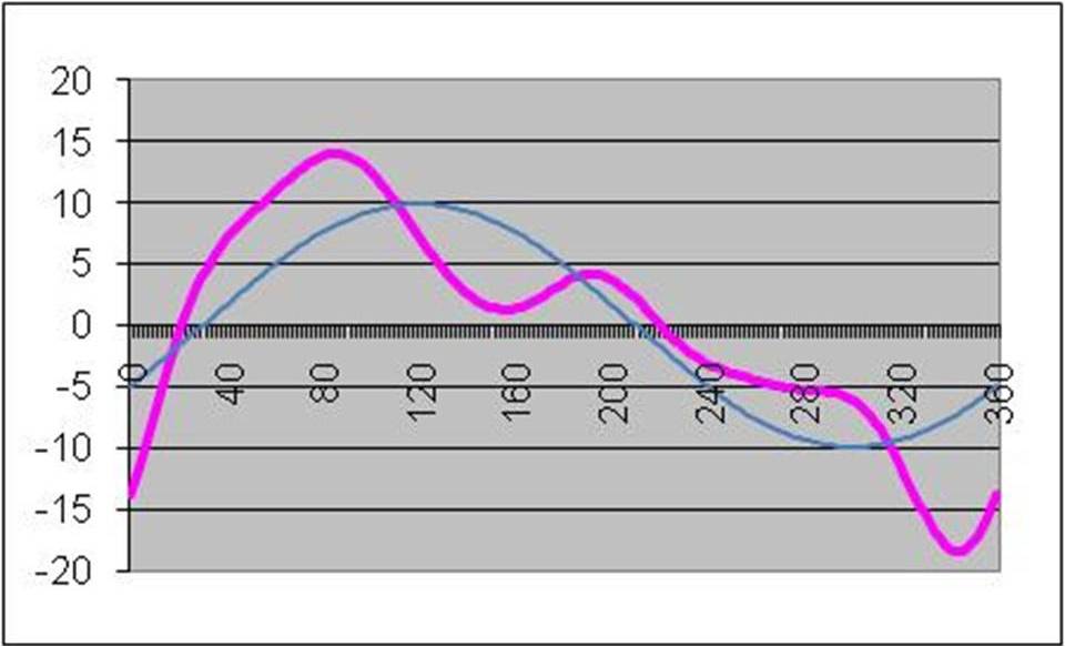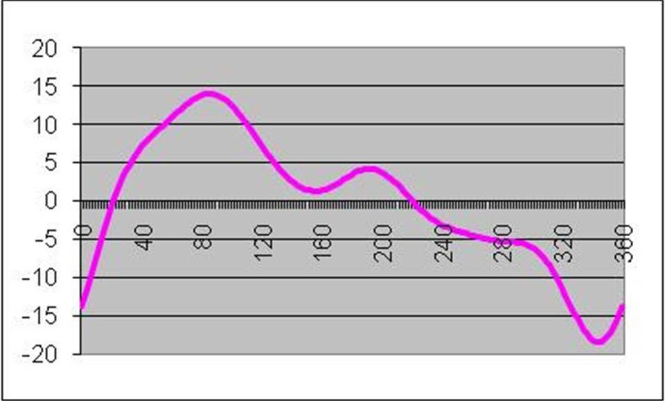 Here’s what you get when you measure a tire on a uniformity machine. This is a plot of degrees vs force variation. Peak to Peak, the values range from +14 to -18.
