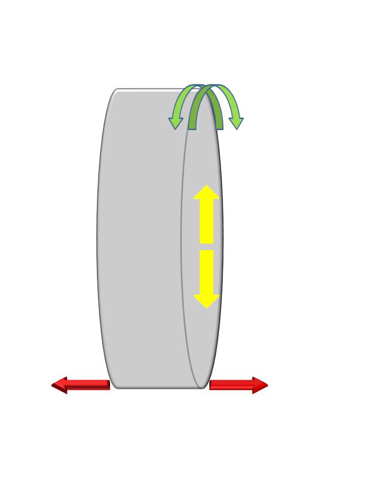 Lastly, the front to back direction from the vehicle’s perspective could be called “Fore – Aft”, but from the tire’s perspective this could also be the “Tangential” direction – the Green arrows.