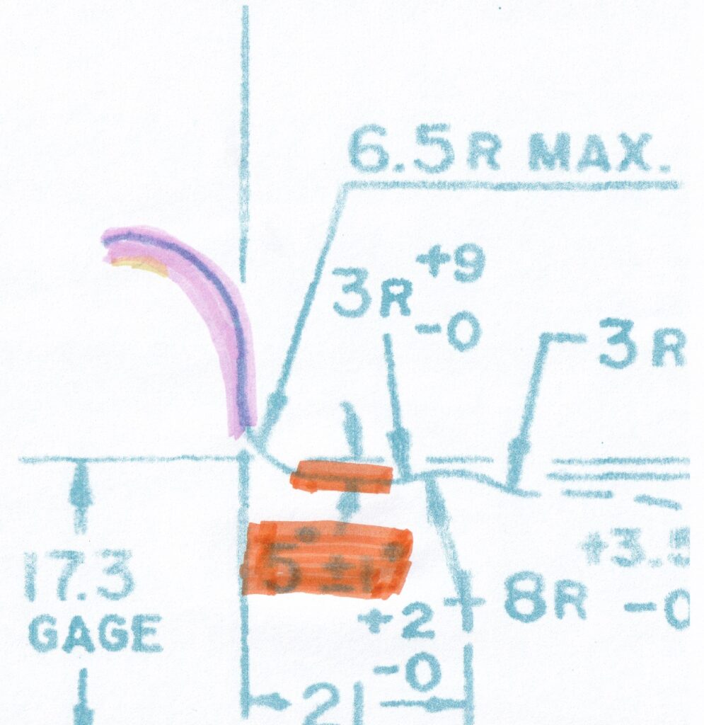 Some nomenclature: I’ve highlighted the “flange” in pink, and the “bead flat” in orange and the space in between is called the “bead heel”. I’ve also highlighted that the bead flat is tapered 5°.