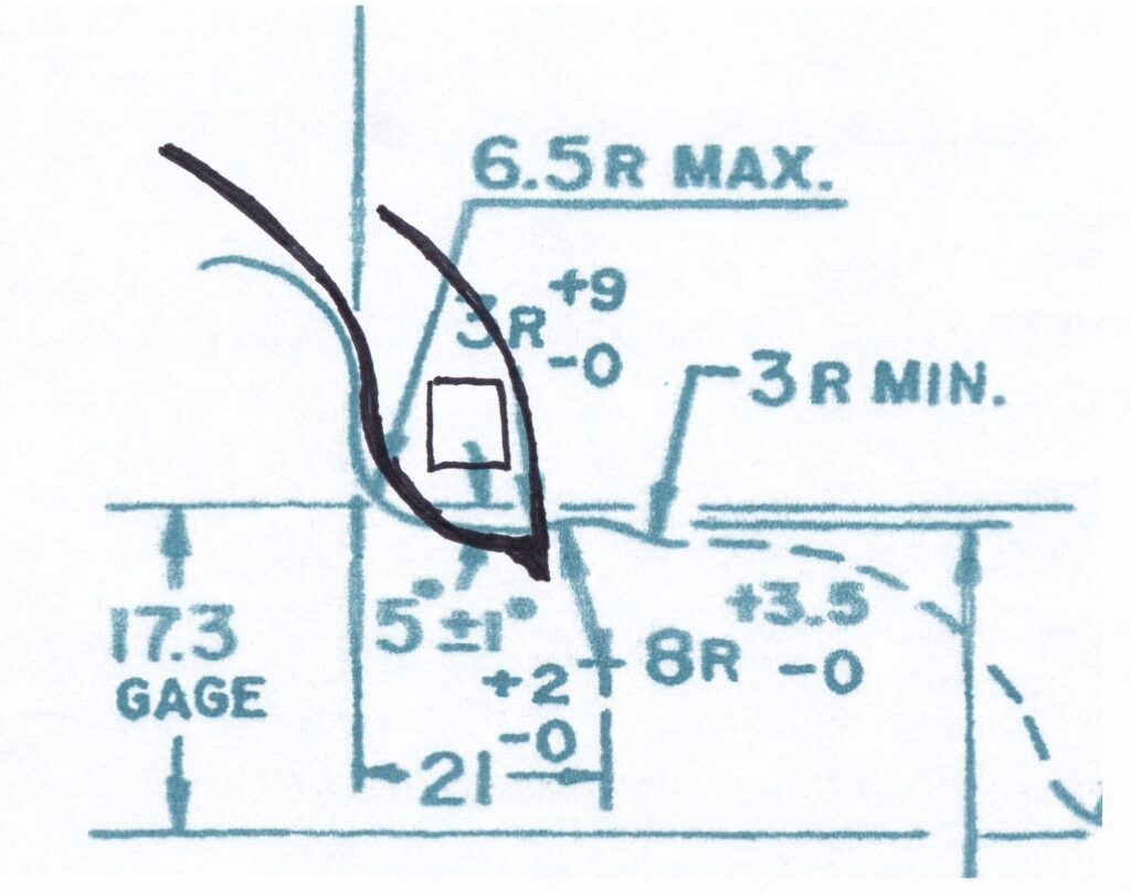 This is the same area as above, but I’ve added (in black) the way the tire bead would sit on the rim. (Please note, I’ve exaggerated the differences.)