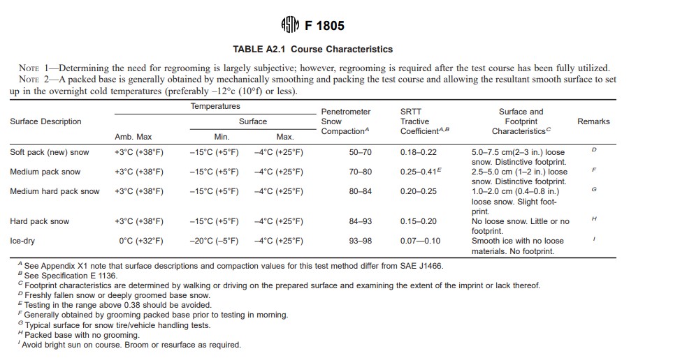 Winter and All Weather Tires: Updated Apr, 2024 In the Apr 8, 2024 issue of Tire Business, a trade magazine for the tire industry, there was an article indicating that "The Wheel Group", a company in California which distributes tires, has halted sales of its AMP brand non-mud-terrain tires because they didn't meet the US and Canadian standards for the Alpine symbol (aka 3PMSF). The tires did meet the European standard. As noted below, there are 2 tests that can be used for the symbol. What I didn't know was that the US and Canada don't approve of the ABS braking test (aka UN ECE R117) . They only accept the ASTM F-1805 test. Interestingly, they tested the tires using F-1805 and they failed! Apparently, they are planning on recalling the tires. I updated the text below to reflect the fact that the US and Canada only accept the ASTM test. Revised Sep, 2023 I found a chart on snow traction. I also found a copy of F-1805 and it included a chart showing the coefficient of friction for the SRTT for various surfaces. Update: Nov, 2022 3 items: