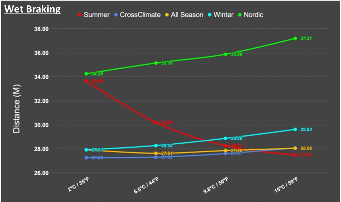 Update Mar, 2024: One of my favorite YouTube channels is Tyre Reviews with Jonathon Benson. He did a test of 5 different tires at different temperatures, trying to establish if the quoted 7°C crossover point was true. (Hint: He did!) But there was one graph that jumped out at me - and it was the one where he verified the 7°C crossover temperature: ![]() Notice that there is group of 3 tires at the bottom that are more or less behaving the same, and 2 tires doing something else. In particular the Summer tire was pretty bad for wet braking at cold temperatures (as expected), but got better as the temperature went up. But the Nordic tire was bad and stayed bad! At least for wet traction. This testing was done before the Ice Grip (Nordic) Symbol was used on production tires, but this seems to verify that wet traction is indeed an issue for these types of tires. I wonder what is going to happen in North America when the symbol becomes common - in particular, will Nordic tires get a reputation of having wet traction issues and thereby hurt sales. Here's a link to the video: |