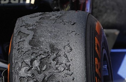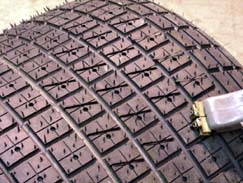 But when the racing is suspended - such during a yellow flag situation, the tires will pick this stuff up. So it has to be removed - and the best way is with a putty knife with the help of a heat source, such as a blowtorch. And it has to be removed to reveal the important tread depth indicators - sometimes called "Dimples" (In the red circle). Those are molded into the tire during manufacture to provide a way to tell how much tread rubber is left. |