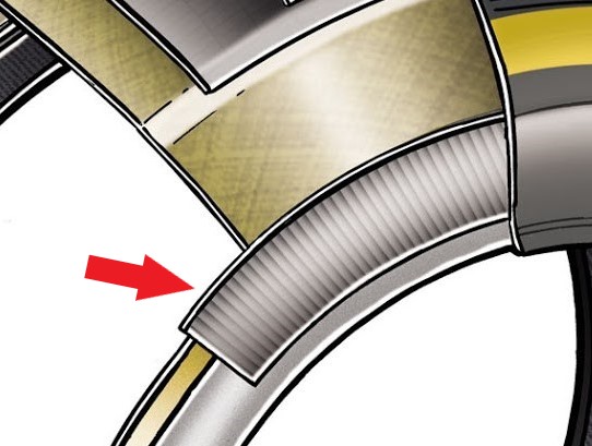 Sidewall: The sidewall is also different in racing tires. Since it is better for the tire to quickly react to steering input, they make the sidewall stiffer. There are a number of ways to do this. The image to the left is the same Pirelli F1 tire image above, but I've pointed to a thing in the sidewall. I think Pirelli is being deliberately vague here, but I would call this a "Chipper", which is a combination of a "Filler" and "Chafer" - both of which are parts of regular tires. The chipper is a fabric insert, usually at an angle (that is, neither radial, nor circumferential.) It greatly stiffens the sidewall. These are sometimes used in RunFlat tires. Further, street tires need to be protected from curb rash (as it is sometimes called). A layer of rubber is applied to the outside of the sidewall. Technically that layer of rubber is "The Sidewall" and what is underneath it is in the "Sidewall Area". Racing tires have no need for such protection, so they don't have such a feature. |