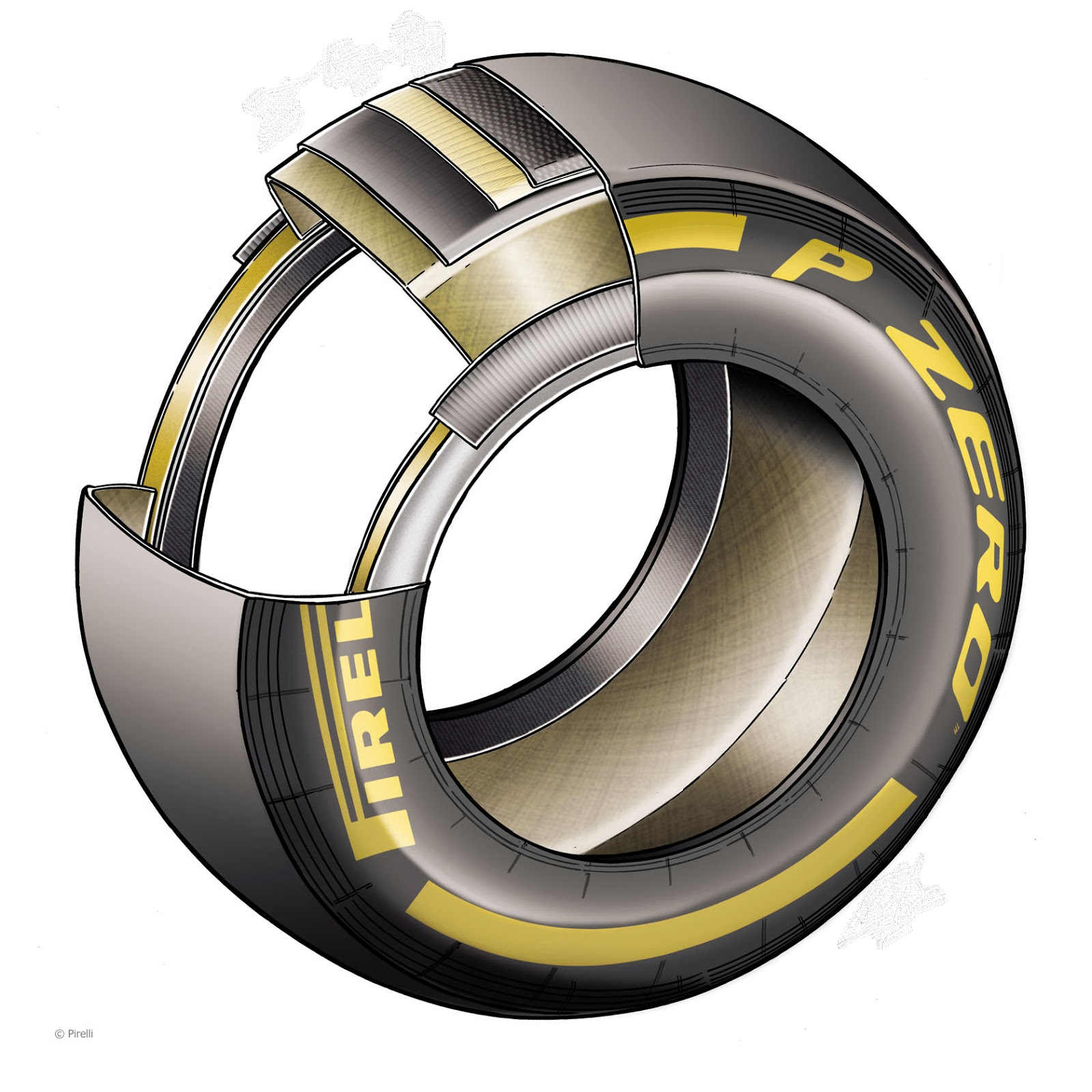 The Belt Package: Please note that this only applies to radial tires. There are no belted bias tires in track racing. And here is where this gets interesting for a tire engineer! In a street tire, the belt package has a number of features to get the tire to survive ten of thousands of miles. But racing tires only need to surivive a hundred miles or so - and that changes everything. Again, the image from Pirelli's F1 tires - and, again, they are being deliberately vague - but a sharp eyed tire engineer will notice those inserts aren't present!! From experience, I know that adding those rubber inserts EXTENDS the miles before the belt package starts to fail! I've looked very carefully when the TV shows failed racing tires, and it is clear they don't have those inserts. But what is also clear is that the 2 belts aren't always steel. Sometimes the top belt appears to be kevlar. I assume they do this because kevlar is better for high speeds. |