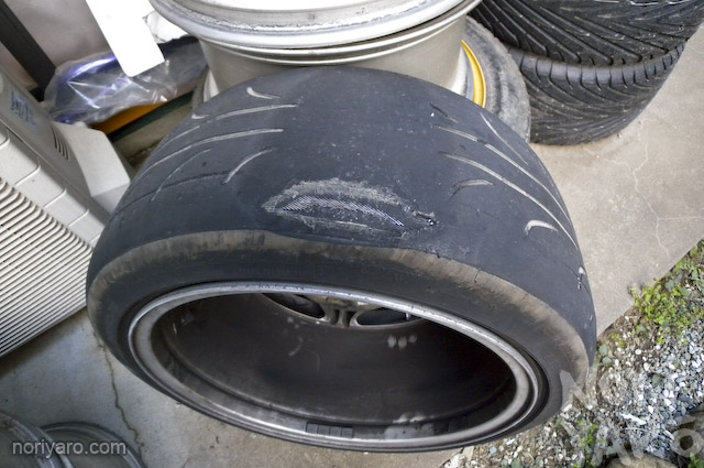 Tires with Spot Wear: This is usually caused by brakes locking, but it can also be caused by skidding out. The tread is worn in one spot. Sometimes it is so severe that the plies will be exposed, like the example to the left. In theory, vehicles with ABS (antilock braking systems, which is most every vehicle today!) should not experience this wear, although it is still possible to get it if you skid out. As a general rule, the tire must be replaced. The exception is if no fabric is exposed and the vibration is tolerable. |