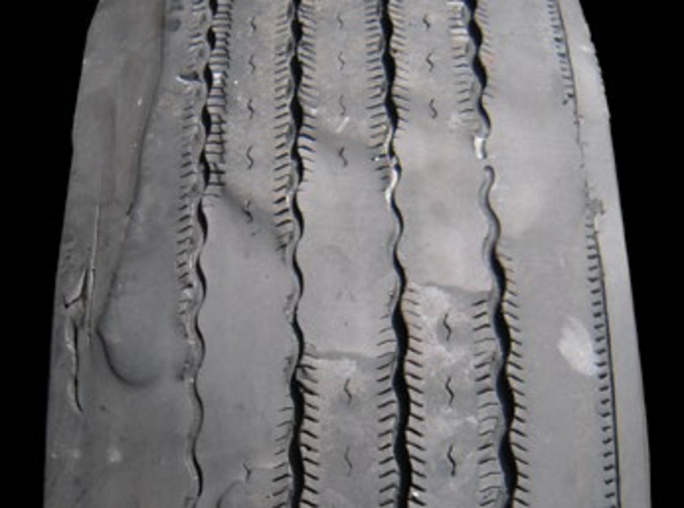 Irregularly Worn Tires: Sometimes tires do not wear evenly - that is, they wear irregularly. That produces high spots and low spots around the circumference of the tire. Some folks call the low spots "flatspots". I hope you can see why that is badly named: The spots have more wear. They are not just flat. The wear on the sample to the right is referred to as "diagonal wear" by folks in the know. Please note that there are other types of irregular wear that have been diagnosed as flatspots - incorrectly, in my opinion. This type of wear is caused by misalignment. Many times, there is a vibration, which is usually how this is discovered. The fix is to get an alignment. Unfortunately that doesn't fix the tire. Rotating the tire to another position can sometimes wear a new pattern on top of the old one and, perhaps improve the vibration. Unfortunately, this usually doesn't work. The alternative is to replace the tire. |