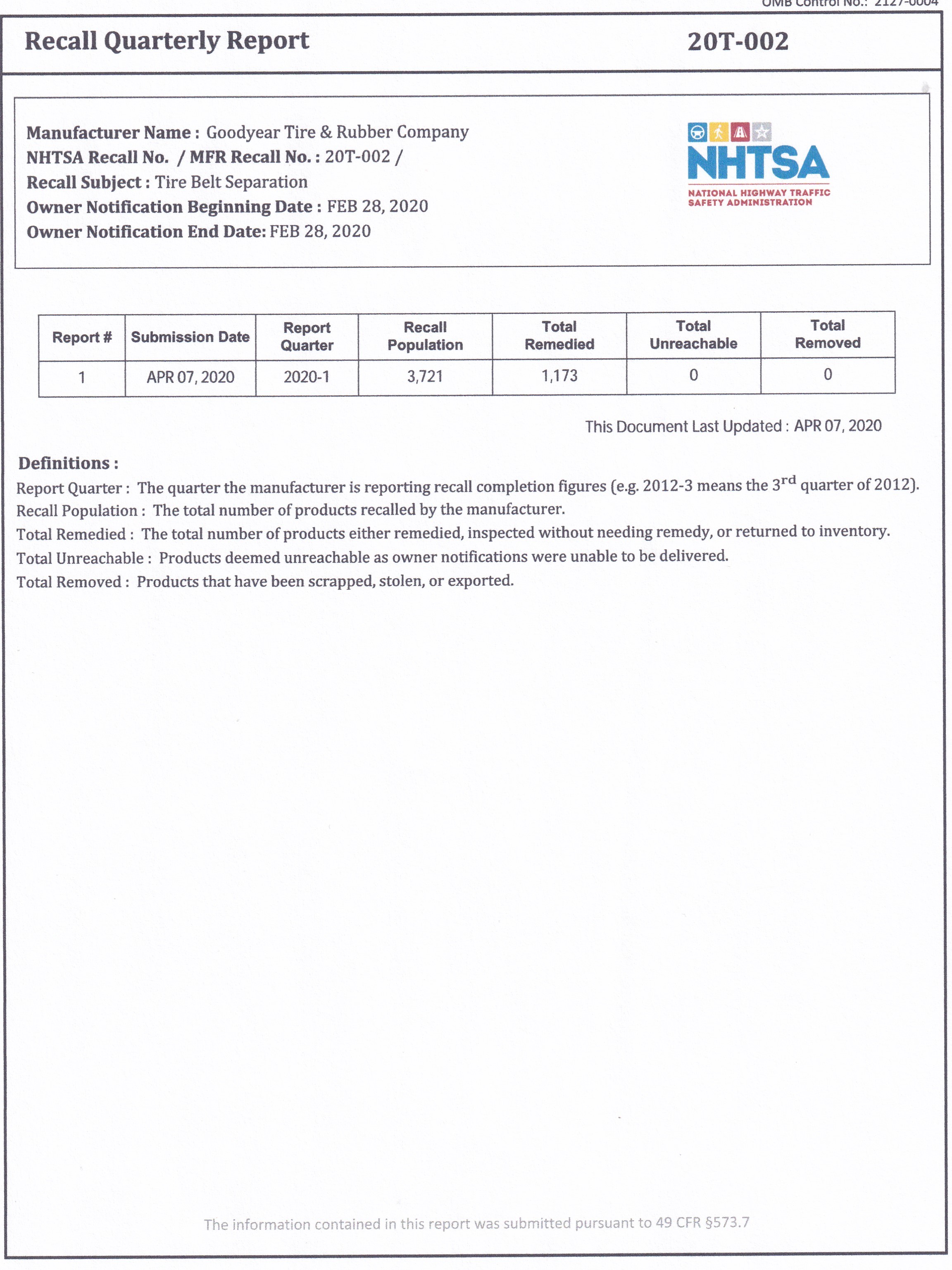 NHTSA requires a followup letter on the status of the recall. Typically, the quantity of tires collected is made. If not enough tires have been collected, NHTSA will ask the company to take additional steps. Usually this means resending the letters, and I suppose other things could be required, but I've never seen that happen. NHTSA has a service where they will notify you on any recall. Here's a link: NHTSA: Recall Subscription | ![]() |